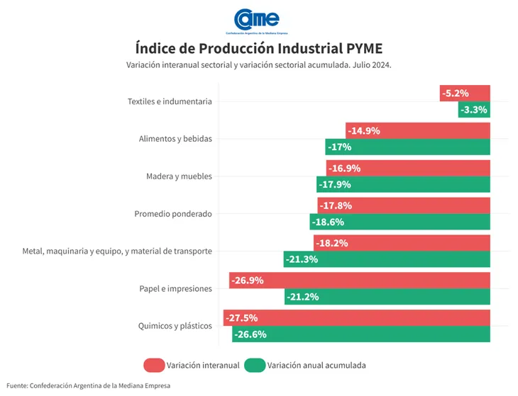 La actividad manufacturera de las pymes cayó 17,8% anual en julio y acumula una retracción de 18,6% en los siete meses del año frente al mismo período de 2023. En la comparación mensual desestacionalizada la producción bajó 1,8%. Las pymes trabajaron en julio con el 60,6% de su capacidad instalada (en junio había sido el 60,1%). Según la Confederación Argentina de la Mediana Empresa (CAME), el 19,3% de las pequeñas y medianas empresas tuvo dificultades para pagar salarios.
