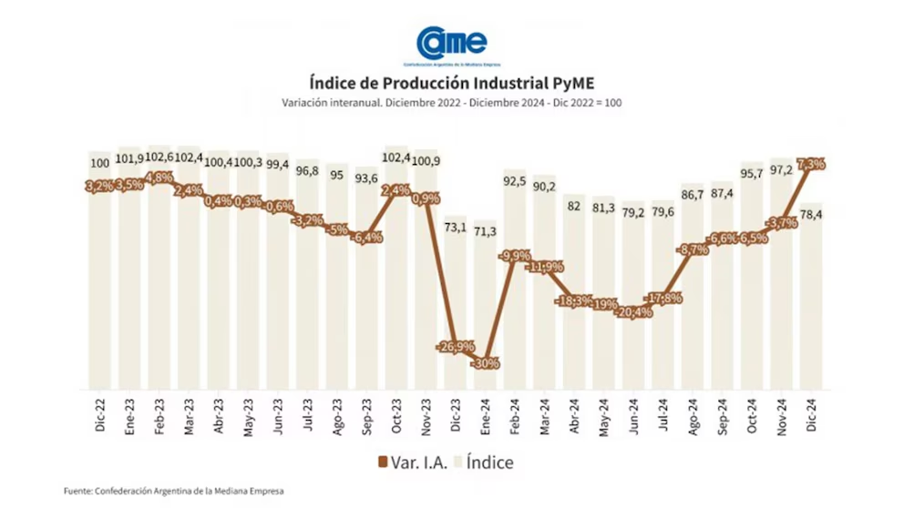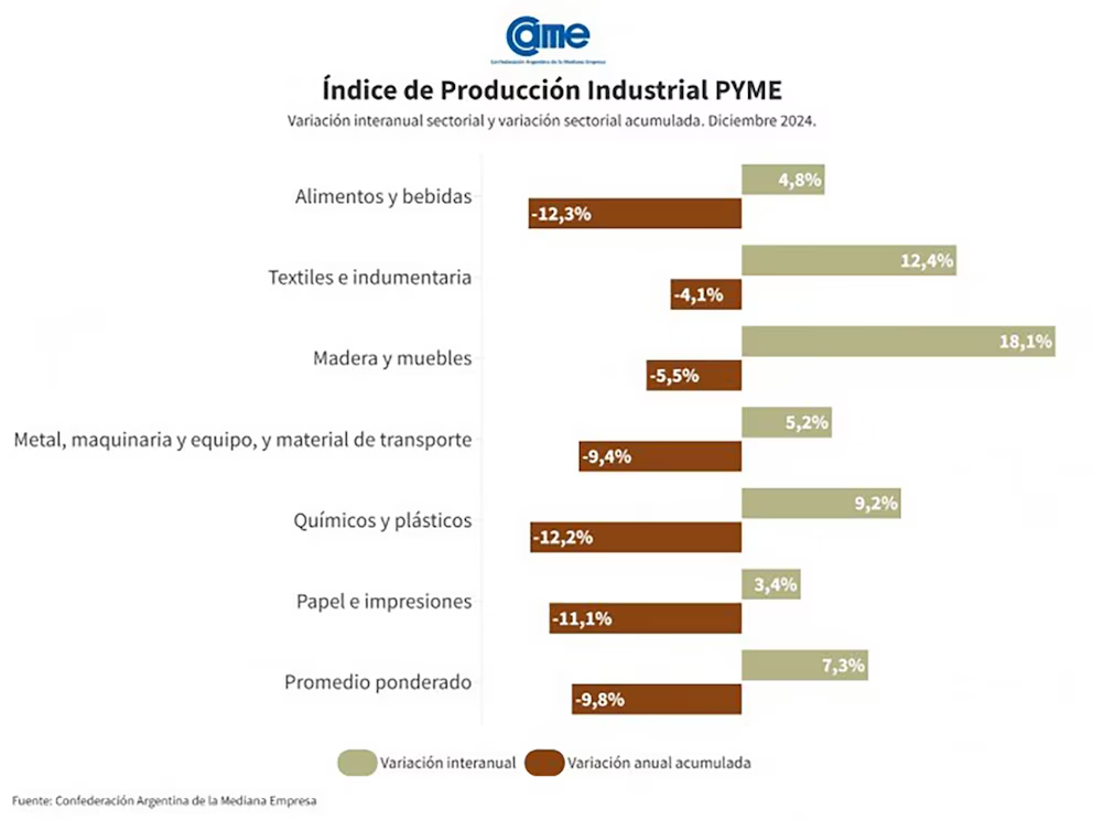 La actividad manufacturera de las pymes creció 7,3% interanual en diciembre y cerró el 2024 con una caída acumulada del 9,8% respecto al 2023. Todos los sectores relevados presentaron variaciones positivas en el último mes del año pasado, según la Confederación Argentina de la Mediana Empresa (CAME). No obstante, los industriales aseguran que las ventas no fueron las esperadas y presentan dificultades por los altos costos.