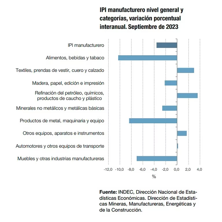 La actividad industrial argentina sigue retrocediendo y parece cada vez más lejos de revertir la tendencia. Según los datos más recientes publicados por el Instituto Nacional de Estadísticas y Censos (Indec), el sector cayó un 3,6% en septiembre en relación al mismo mes del año pasado y llegó a cuatro meses consecutivos con números en rojo.