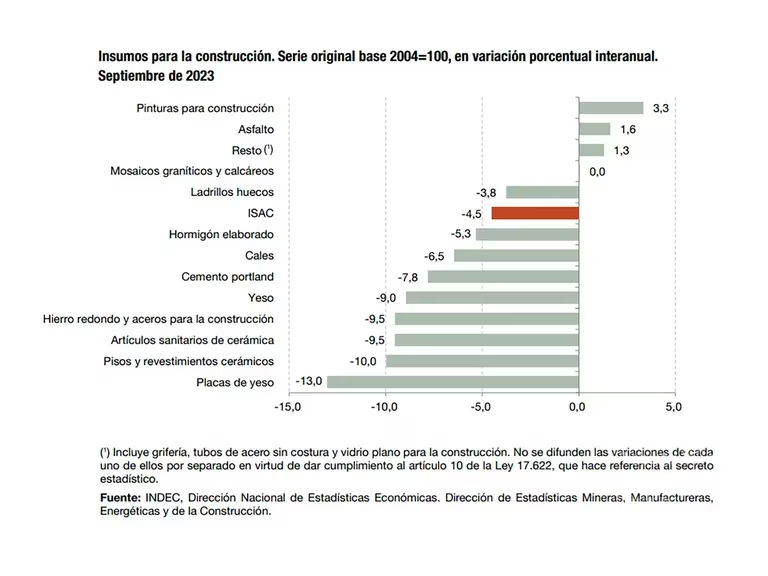 Tampoco la construcción está en su mejor momento. Según los datos oficiales del organismo, la actividad de ese sector retrocedió un 4,5% en septiembre. En este caso, el acumulado a septiembre refleja una caída del 2,9%