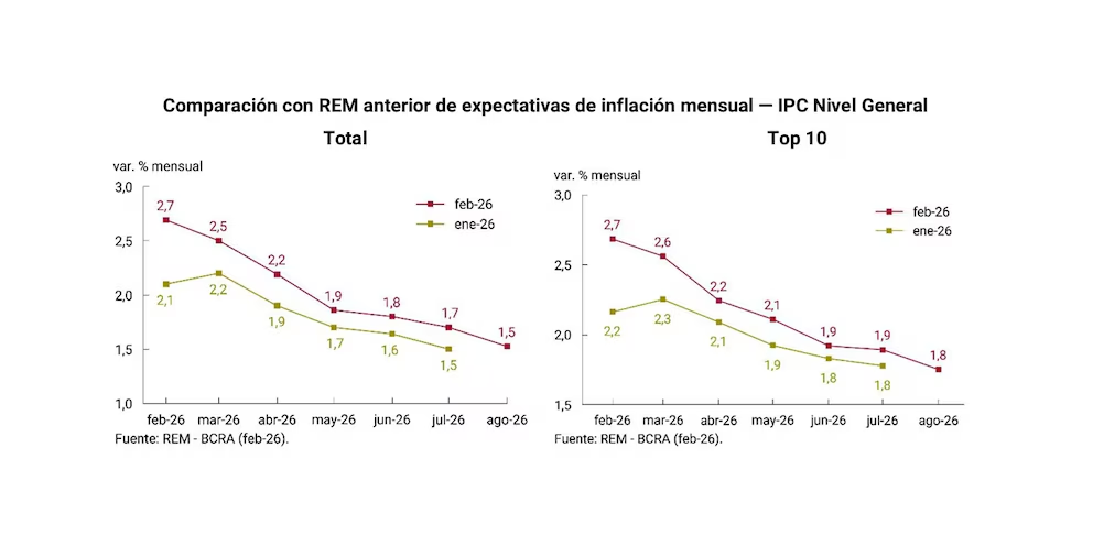 Las expectativas del mercado también se reflejan en el Relevamiento de Expectativas de Mercado (REM) que realiza el Banco Central de la República Argentina (BCRA). El último informe mostró que los analistas y consultoras ajustaron al alza sus proyecciones para febrero: estiman que la inflación de febrero sería 2,7%, un valor que supera por 0,6 puntos porcentuales el pronóstico que figuraba en la consulta anterior.