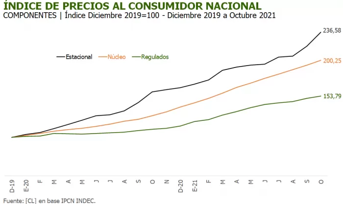 Según lo que informó ayer el Instituto Nacional de Estadística y Censos (Indec), la inflación ya acumula 41,8% en los primeros diez meses de 2021 y la medición interanual alcanzó el 52,1%.