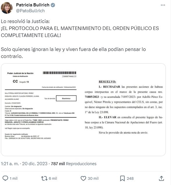 Luego de esta decisión del magistrado, la ministra de Seguridad, Patricia Bullrich, celebró en su cuenta de la red social X y escribió: «Lo resolvió la Justicia: ¡EL PROTOCOLO PARA EL MANTENIMIENTO DEL ORDEN PÚBLICO ES COMPLETAMENTE LEGAL!”.