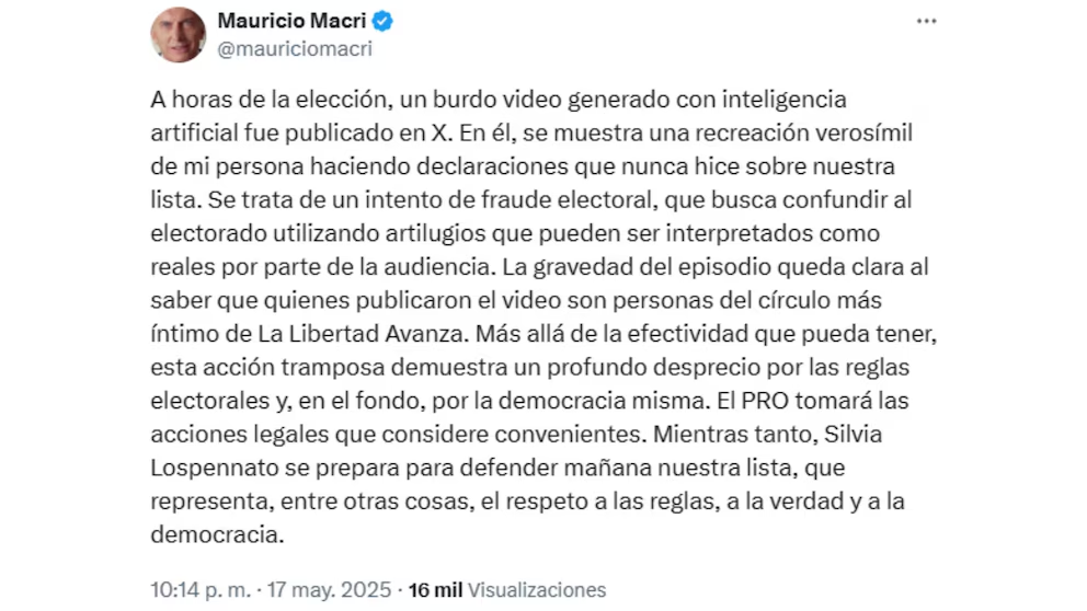 La denuncia se oficializó ante el Tribunal Electoral de la Ciudad Autónoma de Buenos Aires por la difusión de un video creado con tecnología de inteligencia artificial, aparenta mostrar a Macri haciendo declaraciones políticas que podrían influir en el voto, favoreciendo a la lista de Manuel Adorni de la Alianza La Libertad Avanza, en detrimento de la lista encabezada por Silvia Lospennato de Buenos Aires Primero.