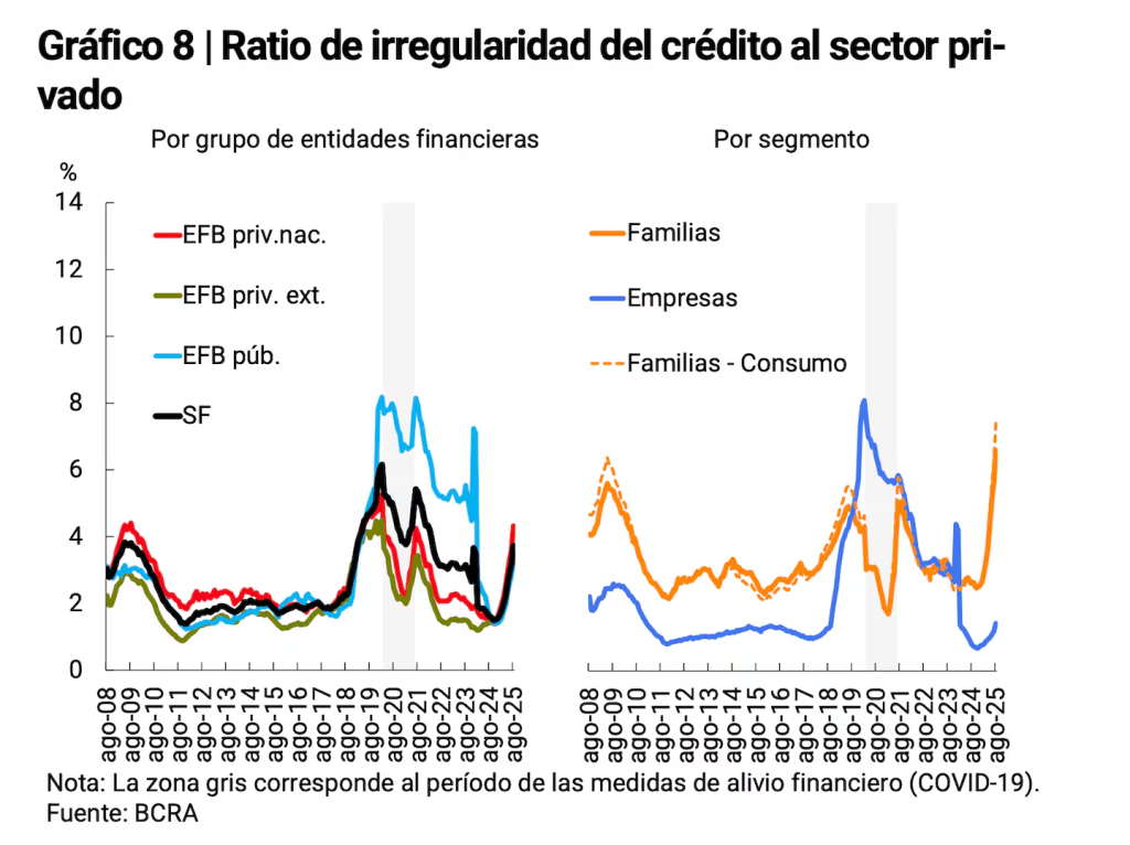 - En préstamos personales, la morosidad de las familias creció un punto y llegó a 8,2% del total, el valor más alto registrado. El incremento el acumulado en 2025 fue de 4,9 puntos.