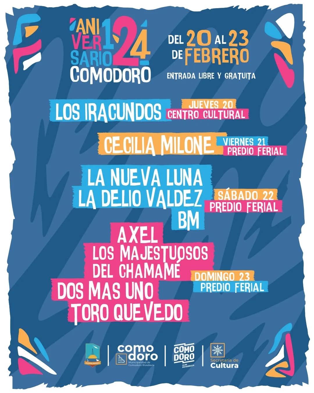 La Municipalidad de Comodoro Rivadavia, a través de la Secretaría de Cultura, realiza los preparativos para festejar su 124º aniversario el próximo jueves 20 de febrero, en un evento imperdible que durará tres días con entrada libre y gratuita en el centro cultural y el predio ferial de la ciudad.