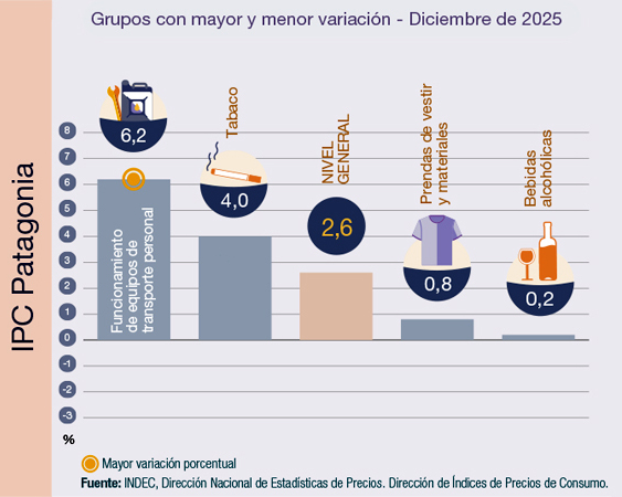 Además, el mismo relevamiento indicó que en la Patagonia el Índice de Precios al Consumidor en diciembre trepó al 2,6%. Los rubros que más subieron fueron Transporte (4,3%), y Alimentos y bebidas no alcohólicas y Comunicación (3%).