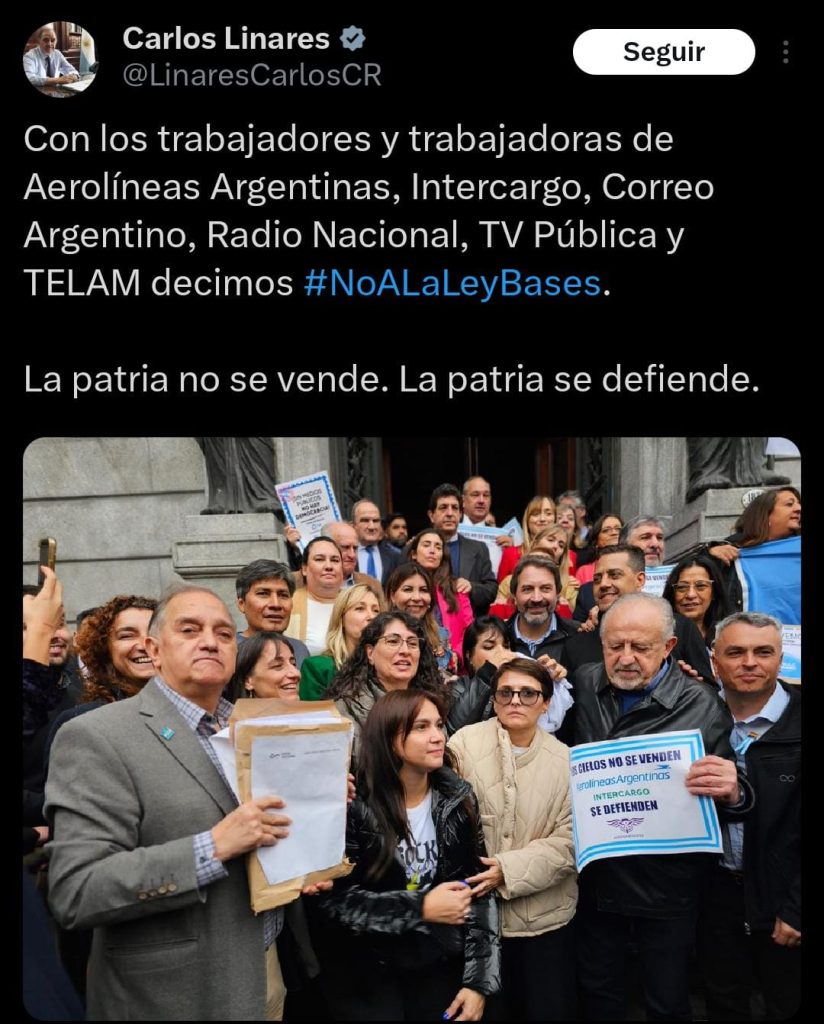 El senador nacional, Carlos Linares, ratificó su negativa ante la Ley Bases que se debatirá en el recinto este miércoles 12 de junio.