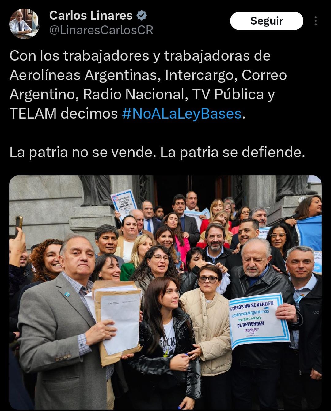 «La patria no se vende, se defiende»-manifestó a través de sus redes sociales en la previa al debate en el Congreso.