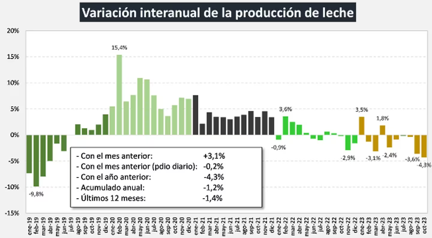 Aunque octubre suele mostrar un crecimiento mensual del 1% al 2%, en esta ocasión experimentó una reducción del 0,2%, desafiando la tendencia histórica. La falta de lluvias afectó negativamente en la disponibilidad de pasturas, verdeos y reservas forrajeras, lo cual generó un escenario desafiante para los productores lecheros.