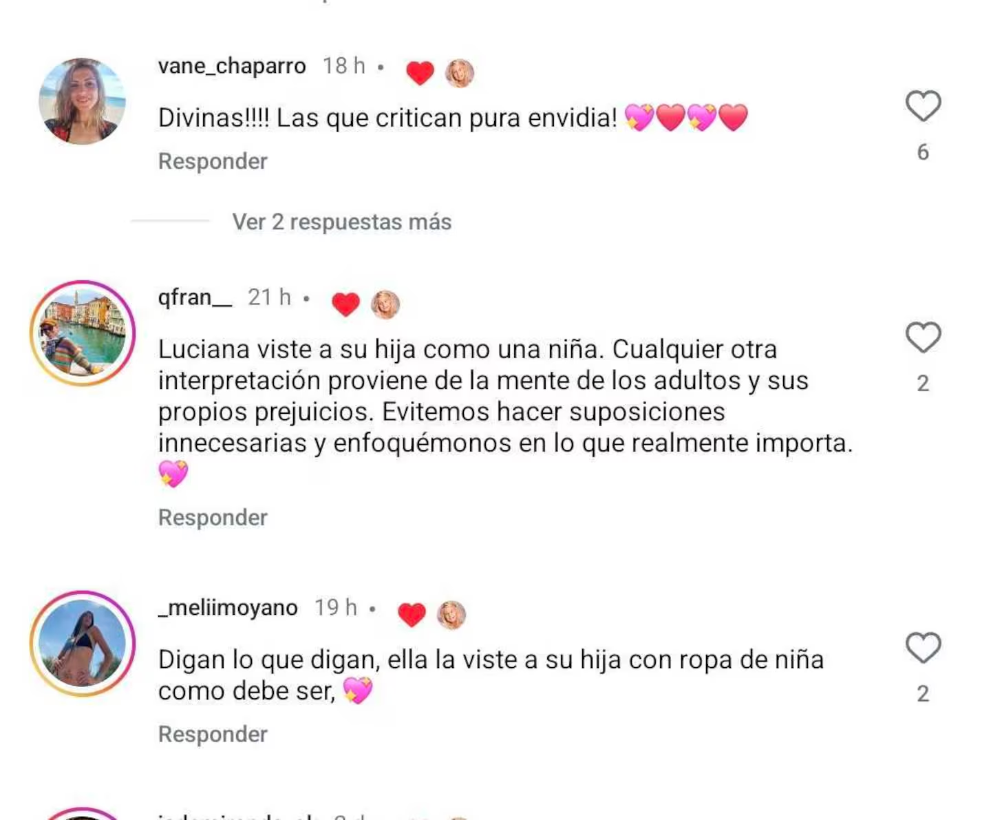 “¡Divinas! Las que critican tienen pura envidia”, escribió una internauta y Luli le dio “like”. “La viste como a una niña. Cualquier otra interpretación proviene de la mente de los adultos y sus propios prejuicios”, le dijo otra persona. “Dian lo que digan, ella viste a su hija con ropa de niña como debe ser”, comentaron también.