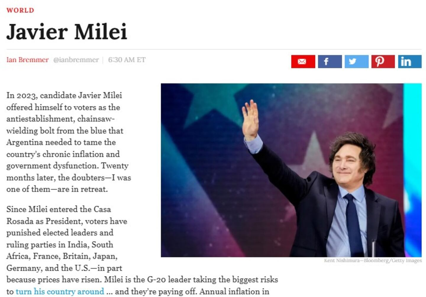 La semblanza sobre Milei fue escrita por Ian Bremmer, columnista especializado en política internacional y editor general de Time. En su texto, Bremmer recordó la irrupción del libertario en la política argentina y cómo se presentó ante el electorado como un “rayo antisistema” que prometía reformas radicales para combatir el descontrol inflacionario y el estancamiento estructural del país.
