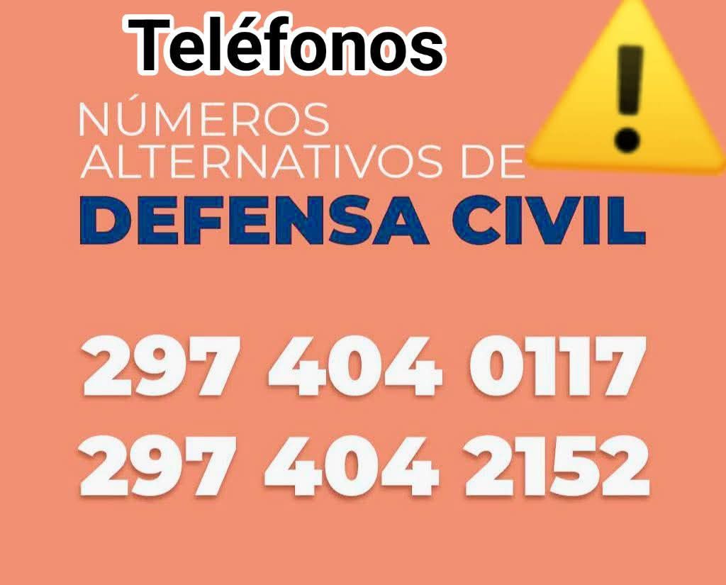 Además, recordó los números de contacto de Defensa Civil para que los vecinos puedan comunicarse ante cualquier emergencia. “Si al 103 les cuesta comunicarse, también están disponibles los fijos 4471650, 4471652, 4471660 y 4472401. Y los celulares 297-404-0117 y 297-404-2152, que funcionan las 24 horas”, detalló.