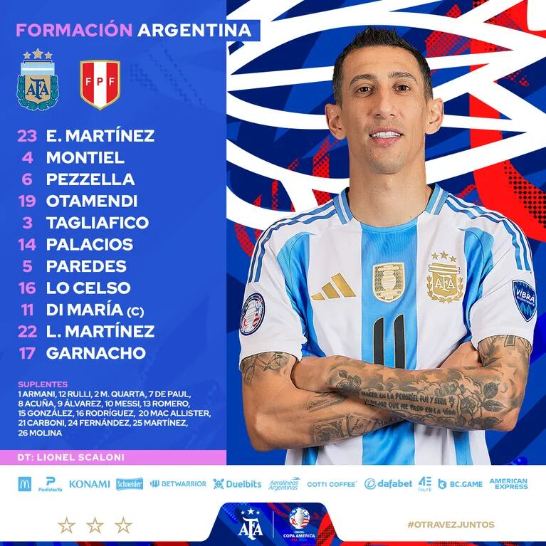 Sin Lionel Messi (lesionado) ni el director técnico Lionel Scaloni (suspendido), la Selección argentina enfrentará a Perú este sábado, a las 21 (hora de la Argentina), por el tercer y último partido de la fase de grupos de la Copa América 2024.