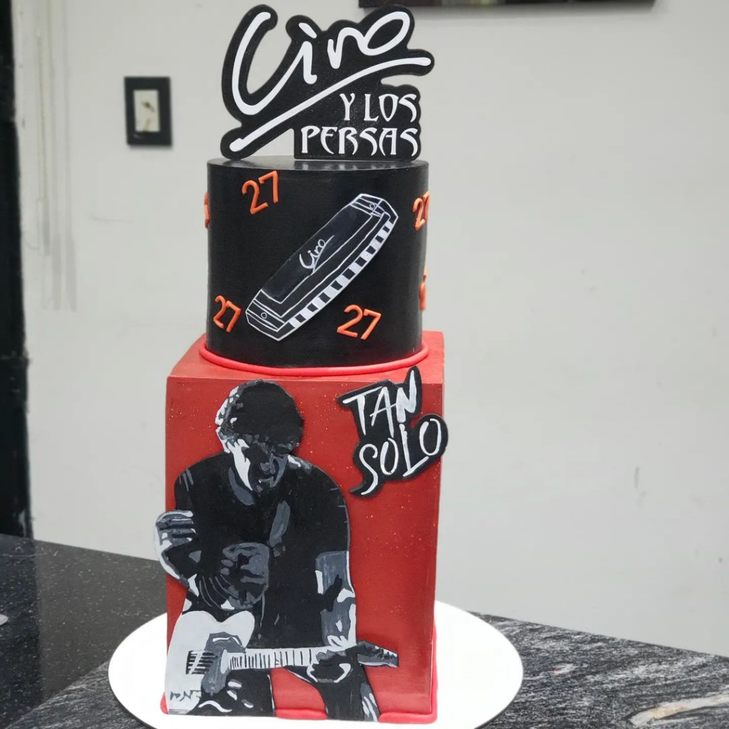 La torta tiene decoración acorde a la banda: el número 27 que los representa, la reconocida armónica de Ciro, la imagen del cantante y el escrito ‘Tan solo’ que se remonta a una de las más afamadas canciones de la exbanda Los Piojos.