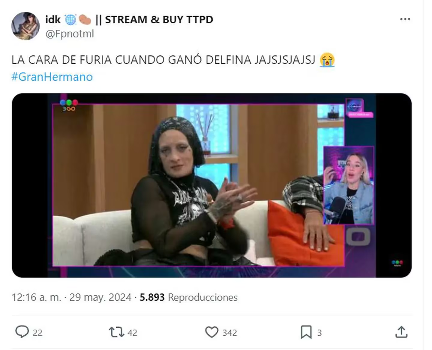 “La cara de Furia cuando ganó Delfina”, lanzó una usuaria en X (Twitter) por la reacción de la participante cuando Santiago del Moro anunció que la hija de Virginia ganó una casa. “Es la verdadera cara de envidia”, opinó otro fanático del reality por esta situación.