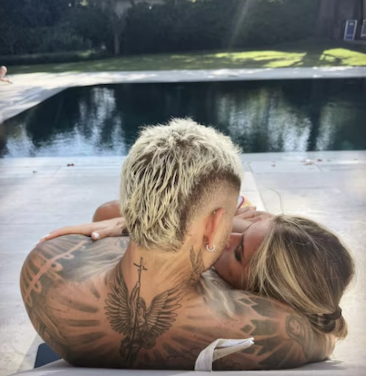 En la primera de las fotos, tomada por una figura misteriosa, los muestra a los dos a abrazados en la misma reposera, con la piscina de fondo y a punto de besarse. La siguiente fue la que generó una catarata de reacciones en los comentarios, ya que un gesto no pasó desapercibido para los internautas.