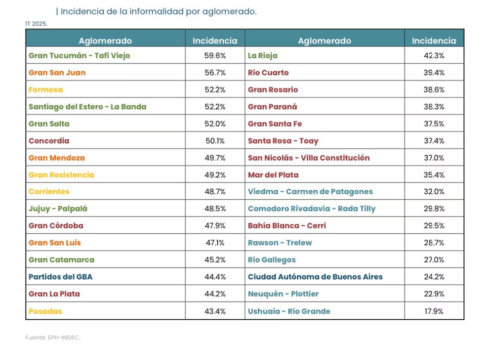 Las demás regiones muestran situaciones diversas entre los distintos aglomerados que las componen. En el NOA, por ejemplo, La Rioja registró una tasa de informalidad de 42,3%, mientras que Gran Tucumán – Tafí Viejo mostró la mayor incidencia entre todos los aglomerados, cercana al 60%.