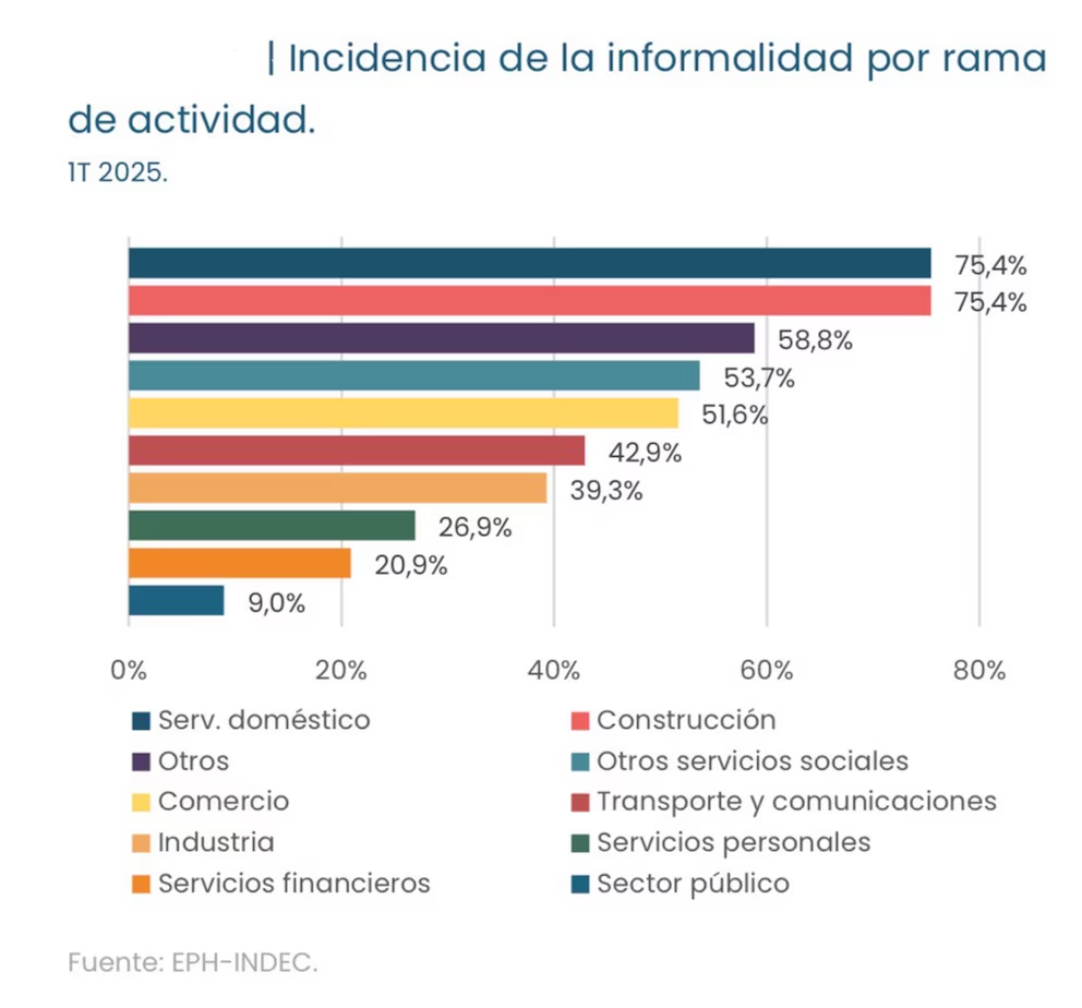 En contraposición, el servicio doméstico y la construcción presentan un nivel de informalidad del 75,4%, ubicándose en el extremo superior del ranking.