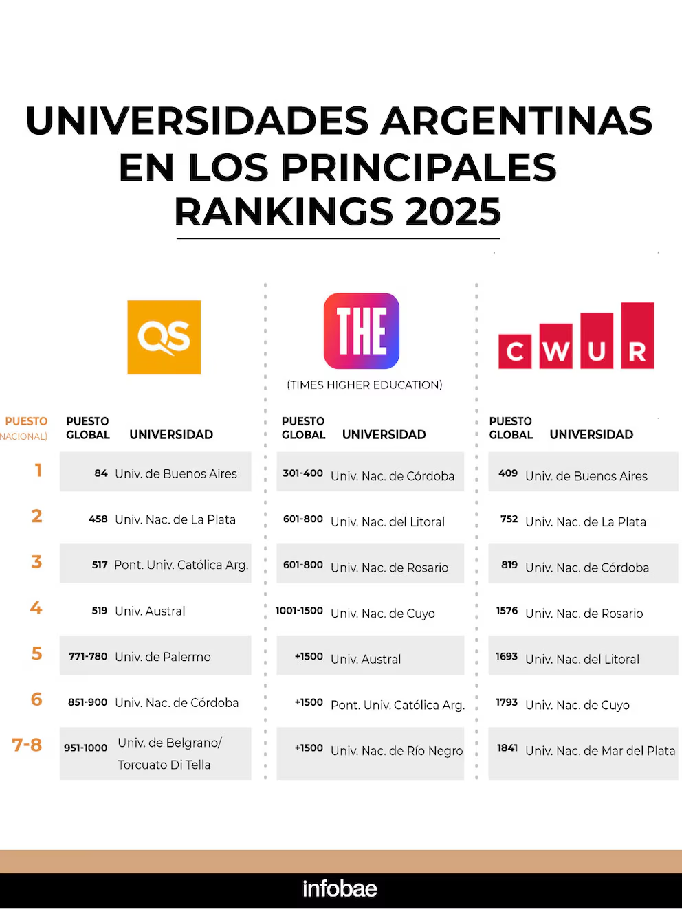 Este mes también se conocieron los resultados del ranking global CWUR, que se diferencia de QS porque les otorga más peso a los indicadores referidos a investigación (40%), complementados con lacalidad de la educación (25%), la empleabilidad (25%) y la calidad de los profesores (10%). En este ranking, la UBA también figura como la mejor del país, pero queda en el puesto 409 a nivel global y quinta en América Latina. Aquí solo clasificaron 7 universidades argentinas, todas públicas, y no hubo instituciones de América Latina en el top 100.