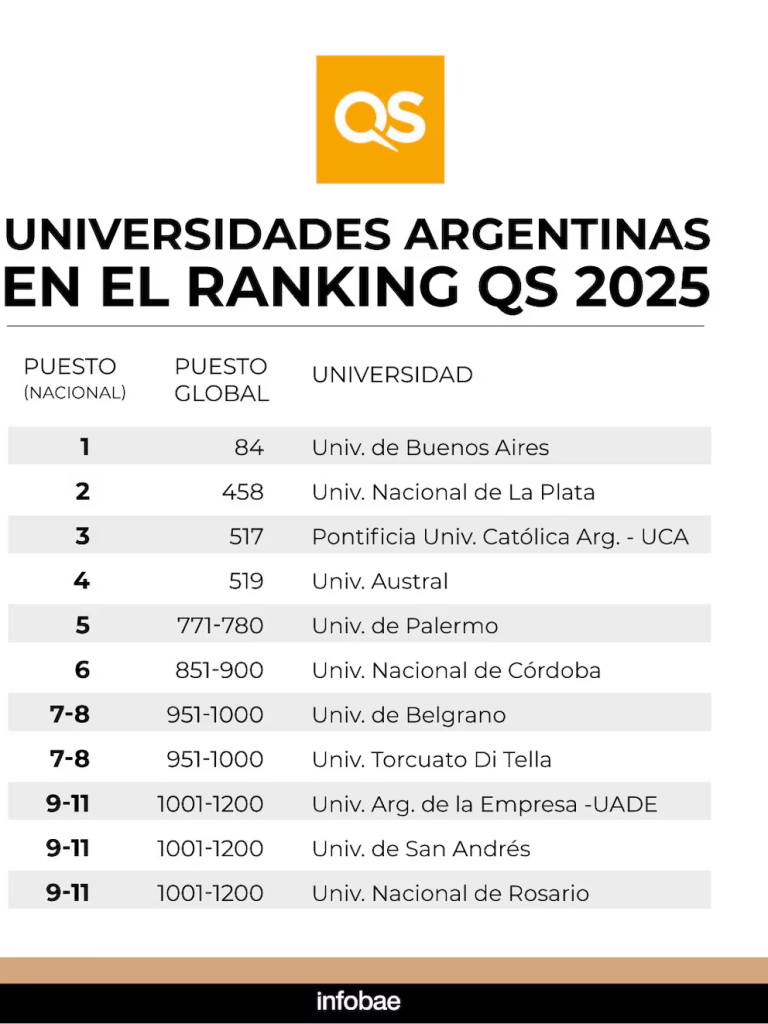 La Universidad de Buenos Aires es la única universidad de América Latina que figura entre las 100 mejores del mundo, según los resultados del ranking internacional de Quacquarelli Symonds (QS), publicado este miércoles. La UBA ocupa el puesto 84° a nivel global: cayó 13 lugares con respecto al año pasado. Desde la universidad atribuyeron ese descenso a los problemas de financiamiento, y particularmente al impacto de los recortes en investigación, indica el sitio Infobae en su informe.