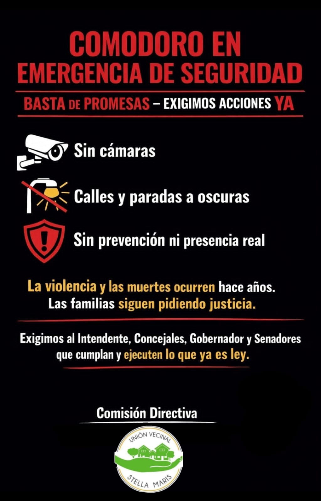 El comunicado interpela a autoridades y legisladores para que pasen del discurso a la acción. «La seguridad no se declama, se ejecuta», sentenciaron desde la vecinal.
