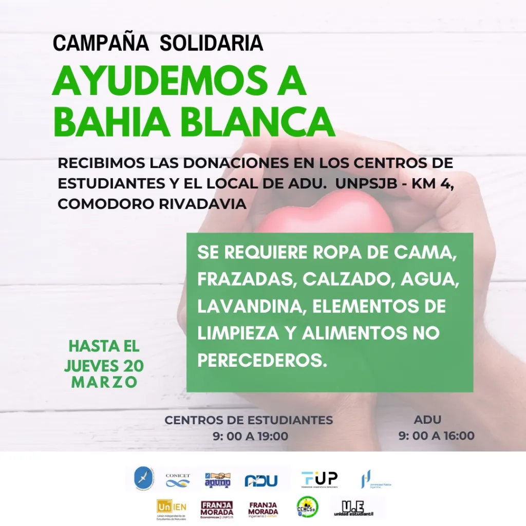 La Universidad Nacional de la Patagonia San Juan Bosco (UNPSJB) lanzó una campaña solidaria llamada «Juntos por Bahía Blanca», en colaboración con organizaciones sindicales, estudiantes y el Rectorado.