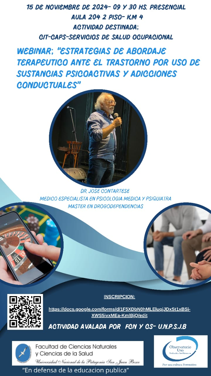 La Universidad Nacional de la Patagonia San Juan Bosco (UNPSJB), a través de su Facultad de Ciencias Naturales y Ciencias de la Salud, llevará a cabo una jornada de capacitación destinada a profesionales de la salud sobre el abordaje de los trastornos por uso de sustancias psicoactivas y adicciones conductuales.