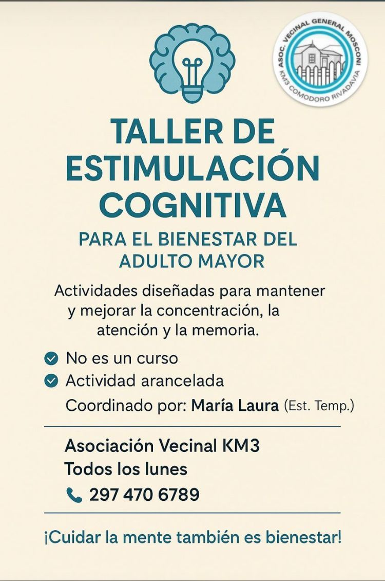 La Asociación Vecinal del barrio General Mosconi, ubicada en Petrolero San Lorenzo 40, invita a los vecinos y vecinas a sumarse al Taller de Estimulación Cognitiva para el bienestar del adulto mayor. Se trata de una actividad arancelada, especialmente diseñada para mantener y mejorar la concentración, la atención y la memoria en personas mayores.
