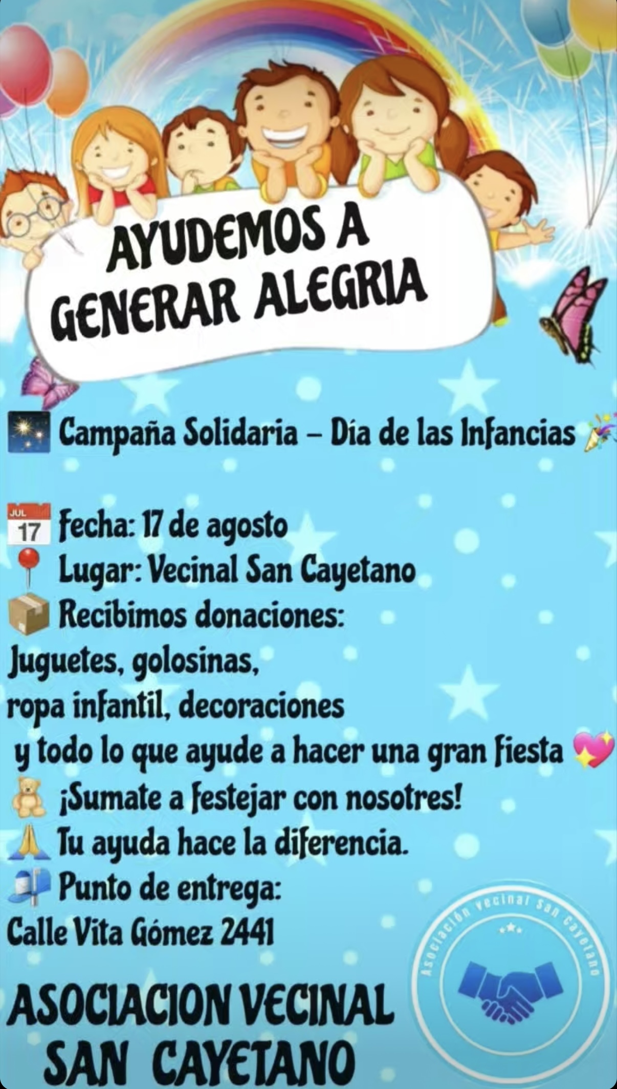 La Vecinal del barrio San Cayetano lanzó una campaña solidaria con motivo del Día de las Infancias, con el objetivo de recolectar juguetes, golosinas, ropa, decoración y todo lo necesario para agasajar a los más pequeños de la comunidad el próximo 17 de agosto.