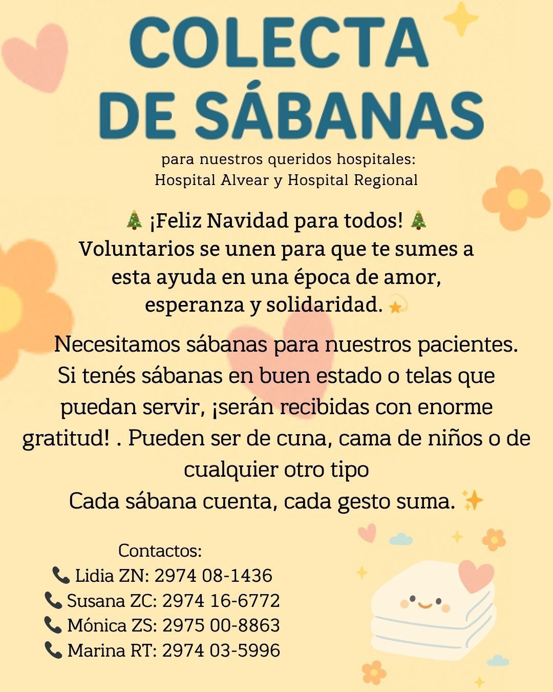 La campaña no solo apunta a las salas de internación, sino también al sector pediátrico: “El pediátrica, neo, para terapia intensiva pediátrica. Sábanas infantiles también pueden ser, de colores, que estén en buenas condiciones”.