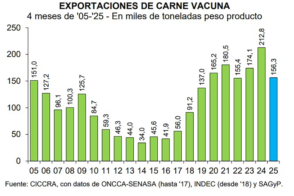 Las exportaciones de carne vacuna argentina acumularon una caída interanual del 24% en los primeros cuatro meses de 2025, en un contexto marcado por la retracción de la demanda desde China y un leve repunte en algunos mercados como Israel y Estados Unidos.