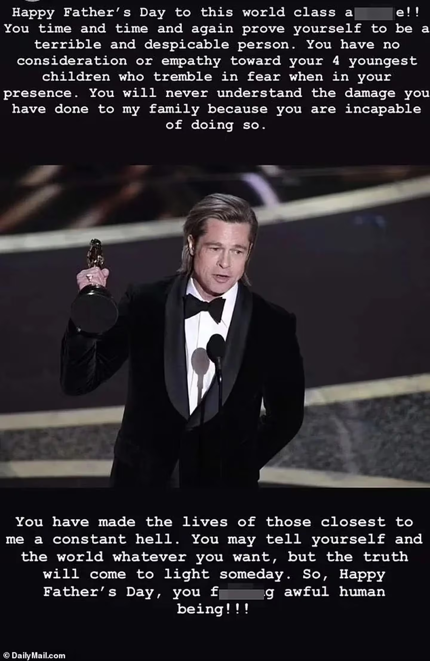 Las críticas de Pax, se dieron en el 2020, pero cómo era una cuenta privada, fue hasta hace pocas horas que fuentes de Daily Mail, pudieron tener acceso a la publicación, en la que Pax publicó una foto de Brad Pitt recibiendo su Oscar cómo Mejor Actor de Reparto por la película Once Upon a Time in Hollywood. La imagen estaba acompañada por un mensaje en el que Pax descarga todo su enojo y desencanto contra su padre.