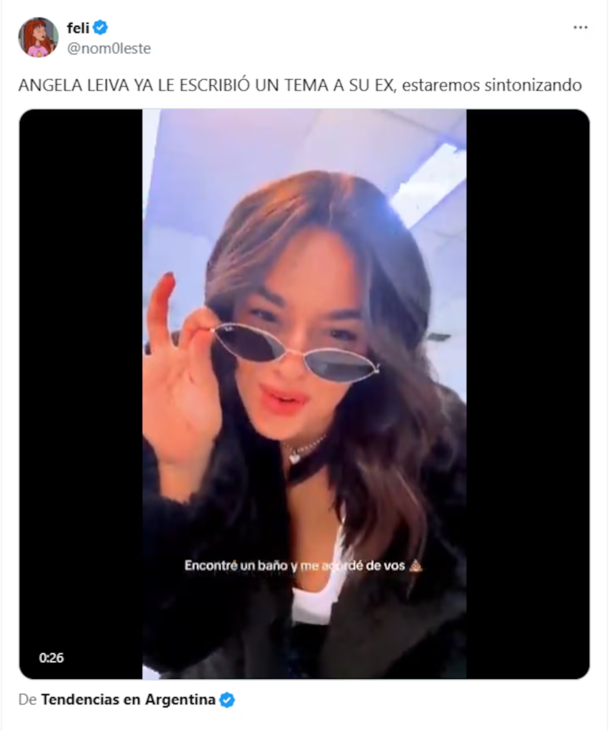 En la grabación se la puede escuchar a Ángela interpretando parte de la letra de su nuevo tema, “Ya me olvidé”. “No eras tan único ni el mejor. No estando en tus brazos volví a ser quien soy”, canta ella en un fragmento del clip con una postura empoderada ante la cámara.
