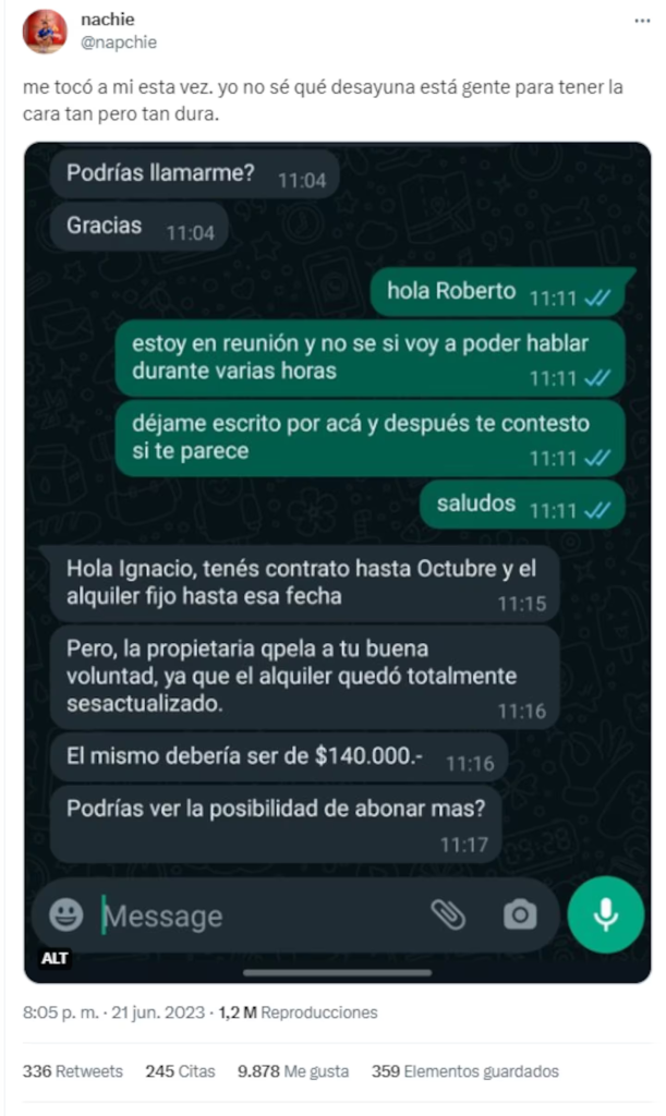 Es que, el hombre le dijo que su contrato era válido hasta octubre y el alquiler fijo hasta ese mes. Hasta ahí todo iba bien, hasta que agregó lo siguiente: “La propietaria apela a tu buena voluntad, ya que el alquiler quedó totalmente desactualizado”.