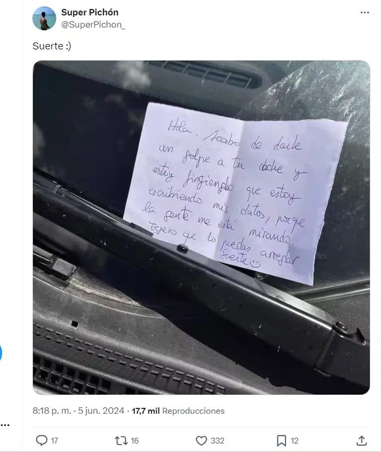 En el parabrisas de su vehículo, el chico encontró un insólito papel que le había dejado escrito la persona que se lo chocó. “Hola. Acabo de darle un golpe a tu coche y estoy fingiendo que estoy escribiendo mis datos porque la gente me está mirando”.