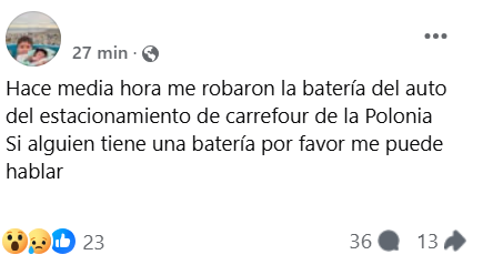Esta tarde, una joven publicó en grupos de Facebook que alrededor de las 16:30 le robaron la batería de su auto en el estacionamiento del Carrefour de la avenida Polonia.