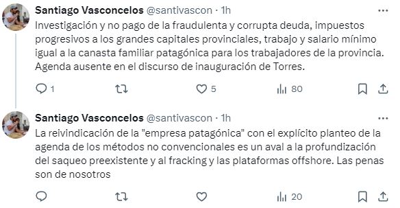 “Investigación y no pago de la fraudulenta y corrupta deuda, impuestos progresivos a los grandes capitales provinciales, trabajo y salario mínimo igual a la canasta familiar patagónica para los trabajadores de la provincia. Agenda ausente en el discurso de inauguración de Torres”, señaló.