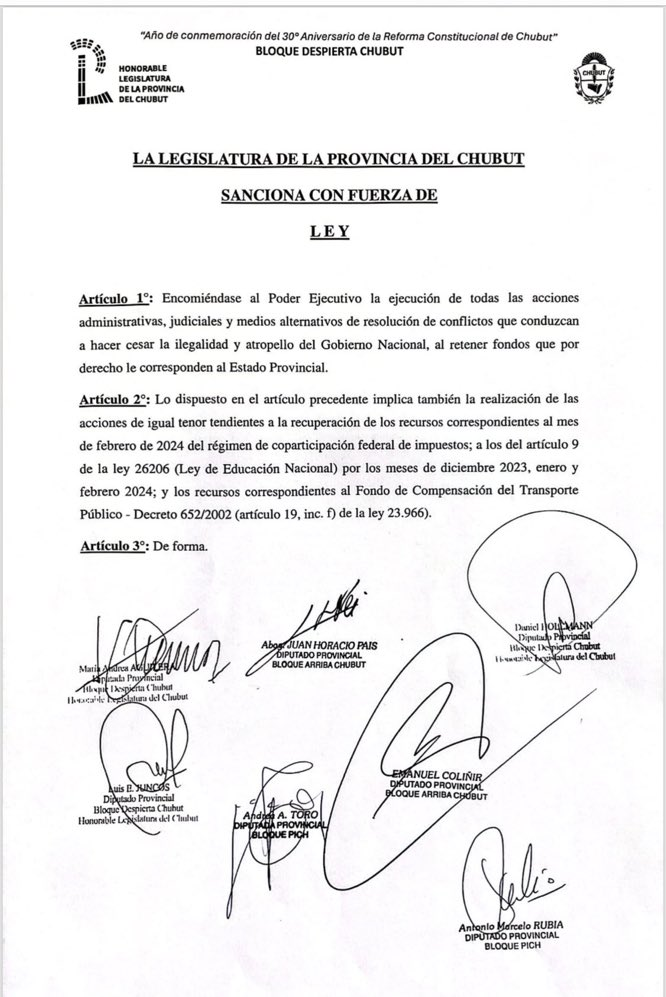 En la sesión presidida por el presidente del órgano legislativo, Gustavo Menna, se autorizó al gobernador Nacho Torres a “llevar adelante todas las instancias administrativas para recuperar los fondos provinciales”.