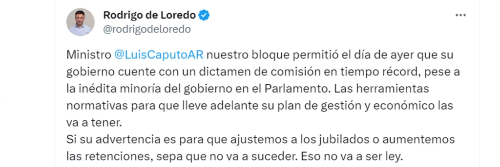 En un fuerte cruce con el ministro de Economía, Luis “Toto” Caputo, el jefe del bloque radical Rodrigo De Loredo adelantó que los radicales no votarán estos dos capítulos si no se hacen nuevos cambios.