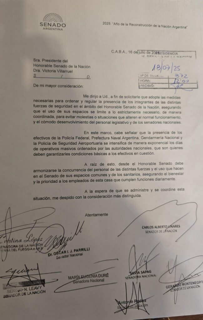 Asimismo, aclaró que “lo que pedimos es que cesen de usar el Senado como cuartel para sus operaciones de los miércoles, destinadas a reprimir a los jubilados que protestan por haberes dignos, una actividad que, lamentablemente, parece ser de su agrado”.