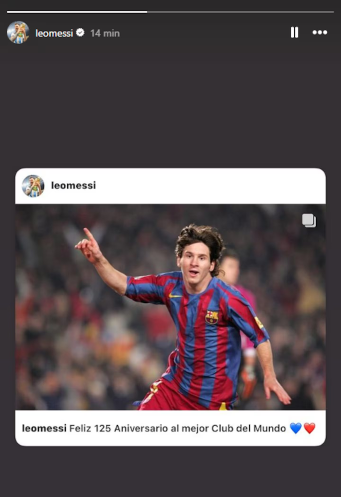 El capitán de la Selección argentina fue contundente con su sentimiento por el Barça. “Feliz 125 Aniversario al mejor club del mundo”, escribió junto a dos emojis de corazones blaugranas. Para esta publicación eligió varias fotos que fueron significativas a lo largo de toda su carrera, desde sus inicios a su última etapa, momentos memorables y la impresionante cantidad de títulos que ganó en el club español.