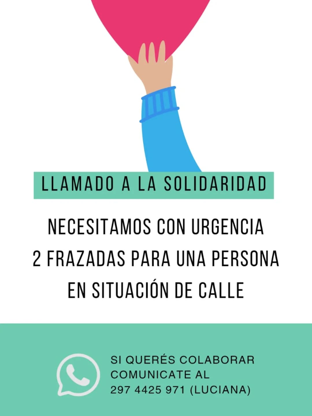 Desde la organización señalaron que cualquier persona que quiera colaborar puede hacerlo comunicándose al número de WhatsApp 297-4425971, a nombre de Luciana.