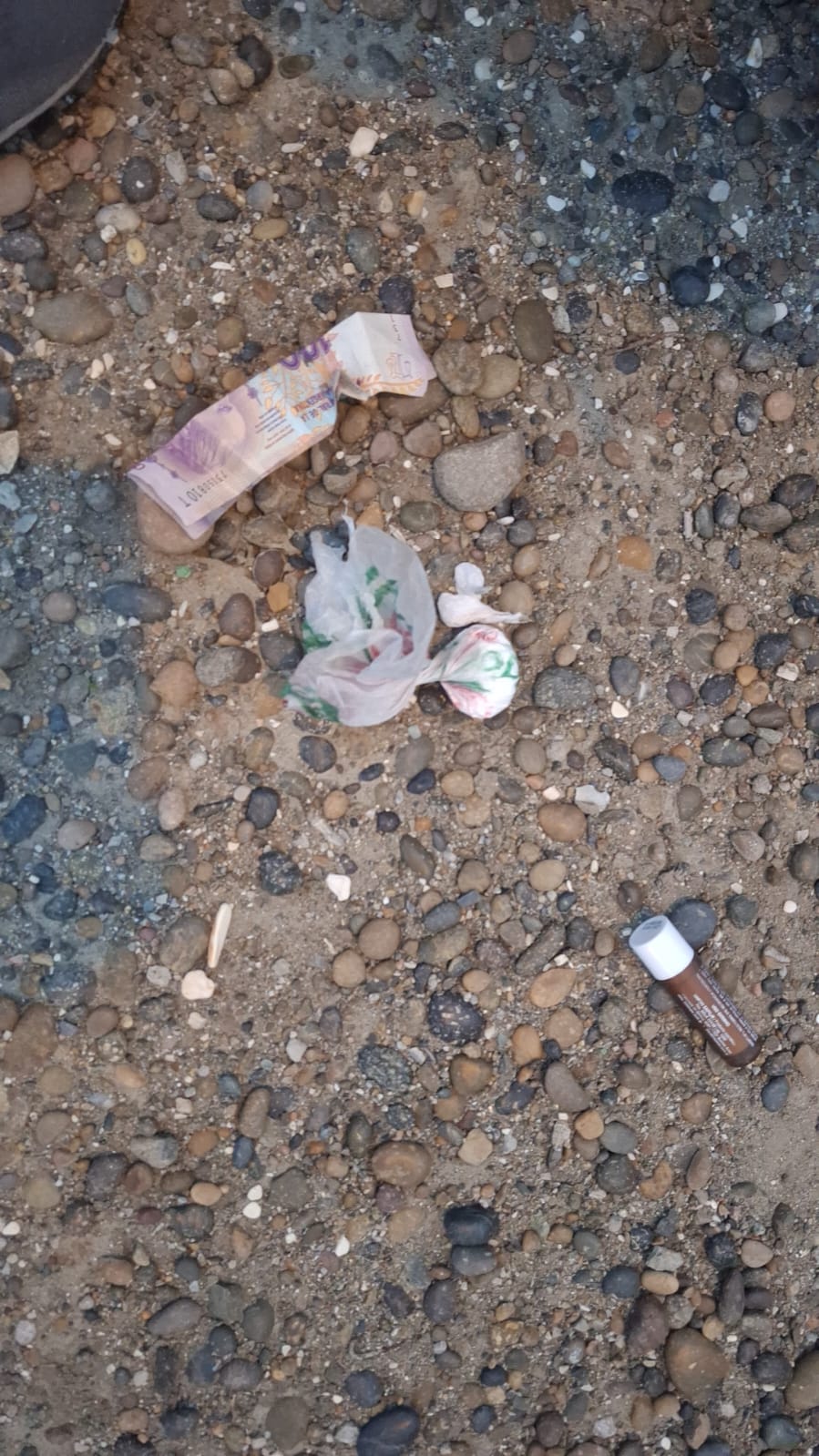 Uno de ellos intenta darse a la fuga, desprendiéndose de elementos en su recorrido, siendo pequeñas bolsitas de nylon, quedando detenido en calle Santa Clara.