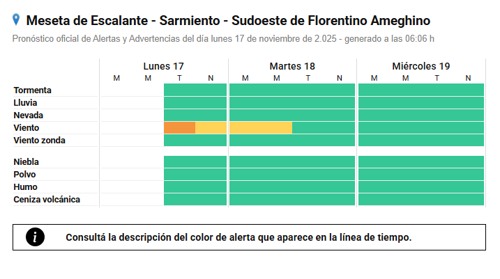 El Servicio Meteorológico Nacional (SMN) emitió este lunes 17 de noviembre una alerta roja por fuertes vientos para el sur de Chubut. Este nivel de alerta implica «fenómenos meteorológicos excepcionales con potencial de provocar emergencias o desastres».