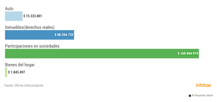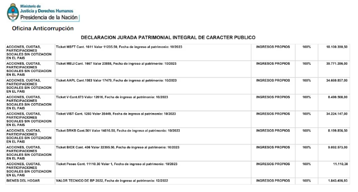 El resto de su patrimonio lo conformaban cuatro cajas de ahorro en el país por $1,7 millones y un auto Toyota Corolla Híbrido que compró cero kilómetro en 2023.