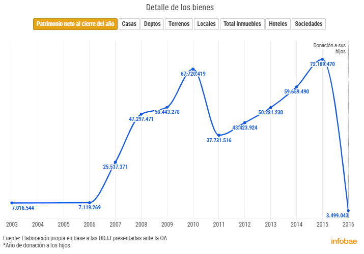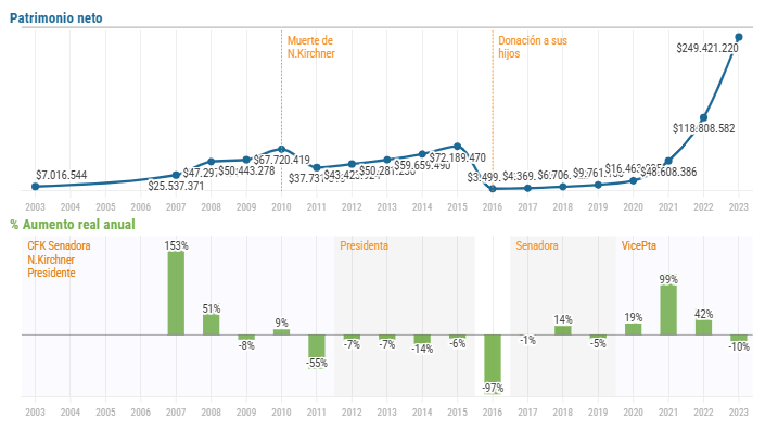 Infobae reconstruyó el crecimiento de su patrimonio neto, a través de las declaraciones juradas que el matrimonio presentó ante la Oficina Anticorrupción, considerando la inflación de cada período, desde que Néstor Kirchner llegó a la presidencia en 2003, hasta que su viuda le donó en vida todos sus bienes a sus hijos en 2016, para eludir posibles embargos judiciales al avanzar las investigaciones de la Justicia en su contra.