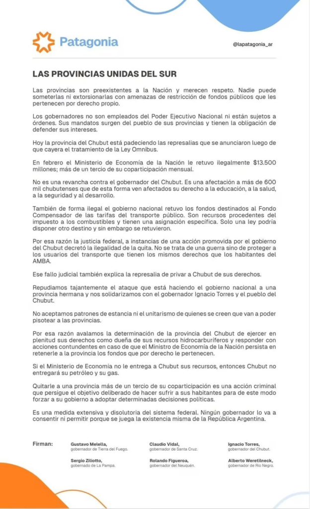 Este sábado, Ignacio Torres ratificó que Chubut no va a entregar petróleo ni gas y anunció que se reunirá esta tarde con los mandatarios patagónicos para tomar “una medida en conjunto”. “Ellos nos ven como una provincia chica y que nos pueden pisotear. Somos una provincia chica pero nos vamos a defender de este gobierno y del que sea”, expresó el gobernador chubutense a TN.