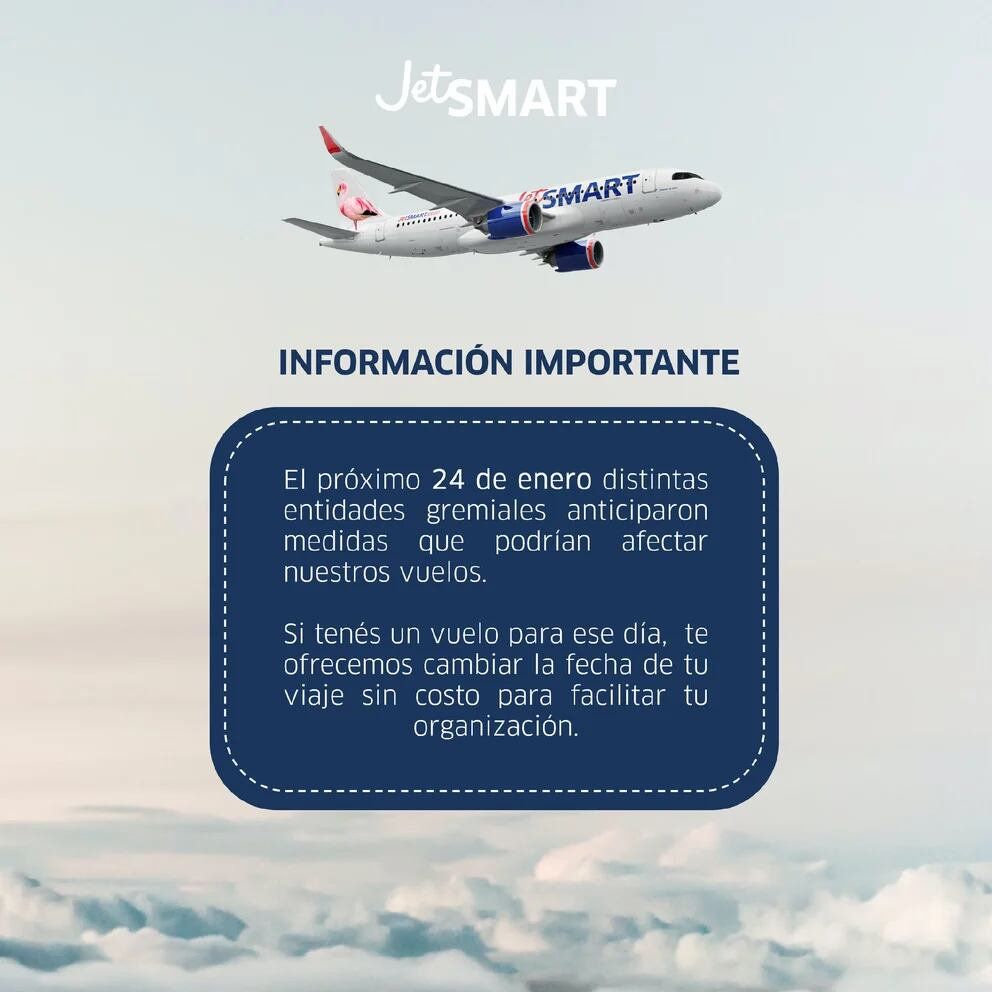 En consecuencia al paro, diferentes aerolíneas anunciaron sus planes respecto de los vuelos que sean afectados por la medida. JetSmart, por ejemplo, emitió la semana pasada un comunicado en sus redes sociales en el que ofrece a los pasajeros reprogramar sus vuelos.