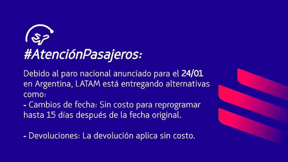 Latam también utilizó las redes sociales para advertir a sus pasajeros sobre las dificultades que pueden sufrir mañana. “En virtud del paro nacional anunciado para el 24 de enero en Argentina, LATAM está entregando alternativas para que los pasajeros con vuelos en esta fecha puedan modificar su viaje”, señaló la compañía en su cuenta de la red social X, y pidió que ingresen a su web para verificar los pasos a seguir.